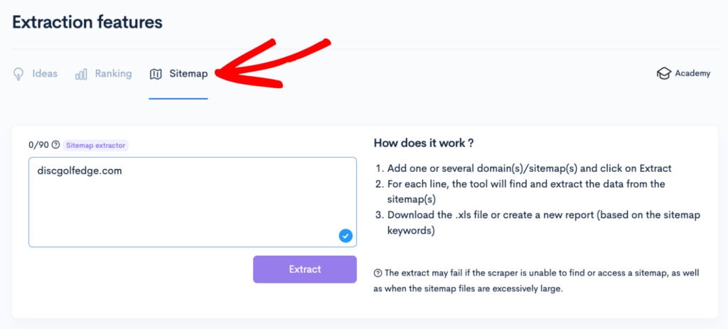 The sitemap extractor retrieves sitemap information from websites, providing insight into a site’s layout, targeted keywords, and content strategy.
