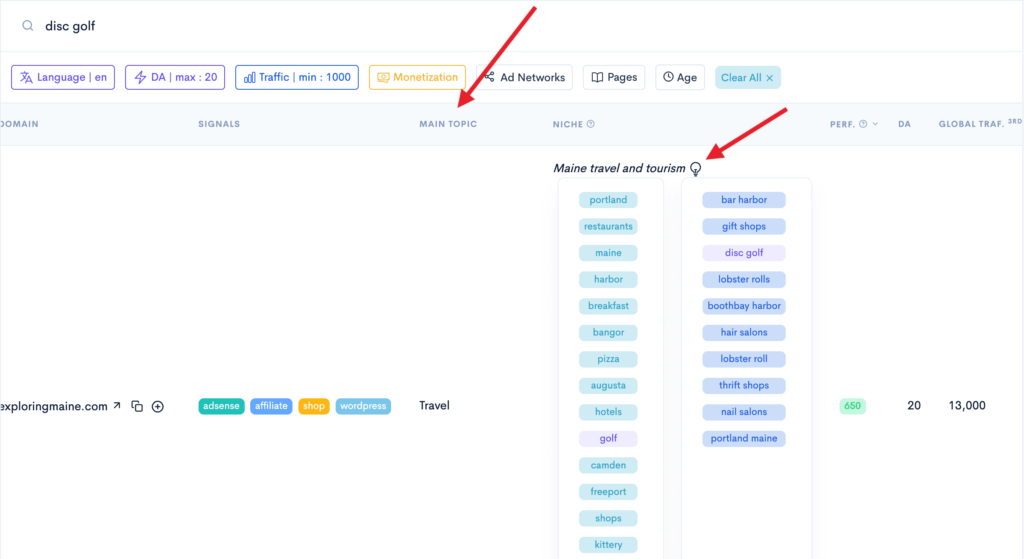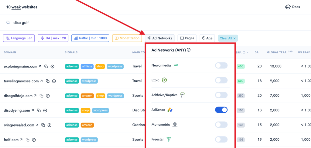 Use the Monetization and Ad Networks filter to explore websites with specific monetization methods, such as Amazon, E-commerce, Ezoic, Mediavine, and more.