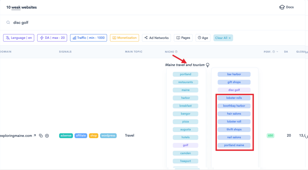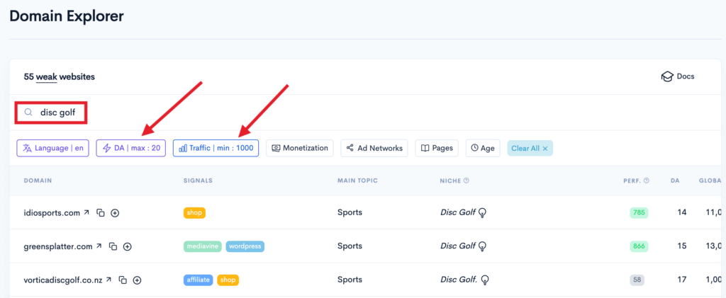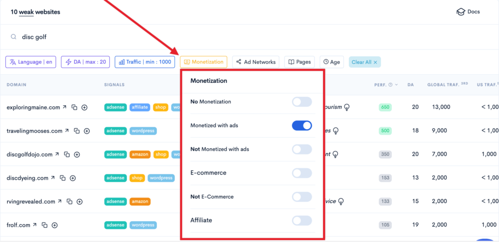 Featuring over 100,000 sites (DA below 25), you can identify potential opportunities using filters such as DA, Traffic, and Monetization.