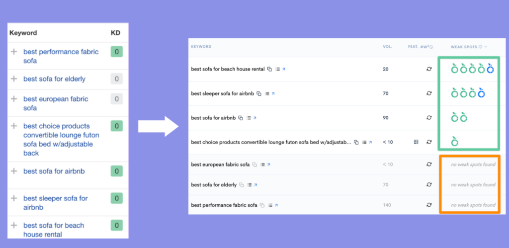 LowFruits, on the other hand, reveals the number of weak spots with each keyword!