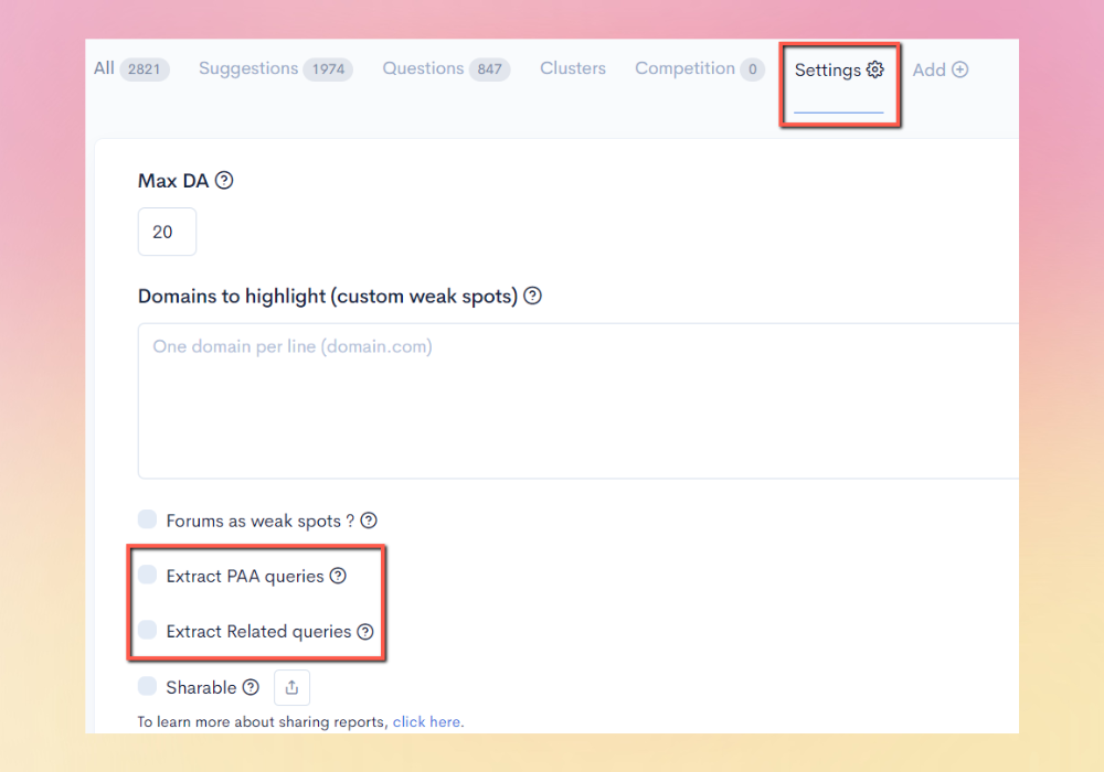 You can find the fetched PAA keywords by activating the PAA switch in the Questions tab (see the “PAA” tag).
